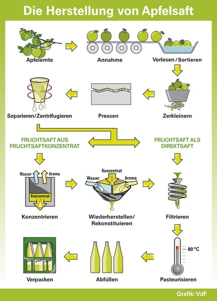 Äpfel beispielsweise werden nach der Ernte verlesen und sogleich aussortiert, denn nur jene Früchte, die sich im optimalen Reifezustand befinden, werden sorgfältig weiterverarbeitet. Nach dem Waschen werden die Äpfel in Mühlen zerkleinert und zu Maische verarbeitet, aus welcher dann durch schonendes Pressen Apfelsaft gewonnen wird. Hierbei entsteht zunächst naturtrüber Apfelsaft. Soll daraus klarer Apfelsaft werden, muss der Saft gefiltert werden.