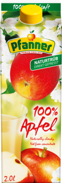 Pfanner 100% Apfelsaft ist ein naturtrüber Direktsaft. Die sonnengereiften Äpfel werden geerntet, schonend gepresst und ohne die Zwischenstufe Konzentrat abgefüllt. Für 1 Liter Apfelsaft werden ca. 1,5 Kilogramm erntefrische Äpfel verarbeitet. Pfanner 100 % Apfelsaft naturtrüb besticht durch seinen frischen und naturbelassenen Geschmack.