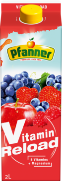 Pfanner Vitamin Reload ist eine Komposition aus roten Früchten wie Apfel, Traube, Aronia, Heidelbeere, Himbeere, Erdbeere und versorgt dich mit 8 essentiellen Vitaminen sowie Magnesium. Diese Extraportion an Vitaminen unterstützt dein Wohlbefinden und das deiner Familie! Bereits ein Glas (250 ml) deckt den Tagesbedarf an Vitamin C, welches zu einer normalen Funktion des Immunsystems beiträgt. Magnesium trägt zu einer normalen Funktion der Muskeln und des Nervensystems bei.