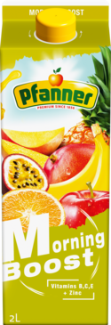 Pfanner Morning Boost ist eine Komposition aus gelben Früchten – darunter Orangen, Maracuja, Ananas, Pfirsich, Banane und Mango – und versorgt dich mit den lebensnotwendigen Vitaminen B, C, E + Zink. Diese Extraportion an Vitaminen unterstützt dein Wohlbefinden für einen aktiven Start in den Tag. Bereits ein Glas (250 ml) deckt den Tagesbedarf an Vitamin C, welches zu einer normalen Funktion des Immunsystems beiträgt. Vitamin B12 trägt zur Verringerung bei von Müdigkeit und Zink zum Schutz der Zellen vor oxidativem Stress.