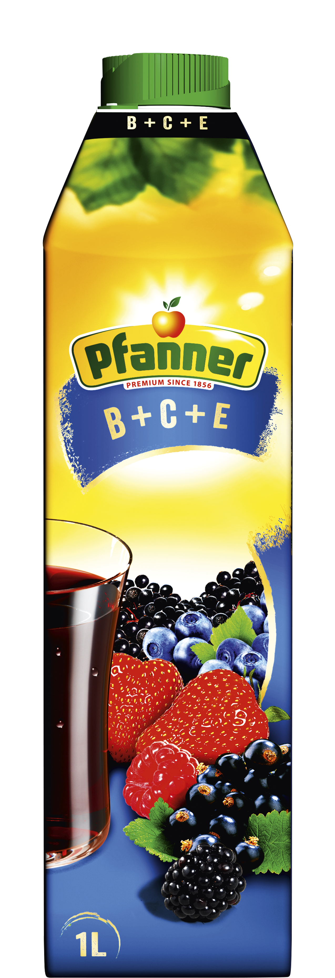 Apfel, Aronia, rote Traube, schwarze Johannisbeere, Holunder, Erdbeere, Himbeere, Heidelbeere und Brombeere werden für Pfanner BCE Waldfrucht zu einem einzigartigen, beerig-fruchtigen Geschmackserlebnis kombiniert. Bereits ein Glas von 200 ml deckt 30% des Tagesbedarfs an den Vitaminen C, B1, B6, B12 und E.
