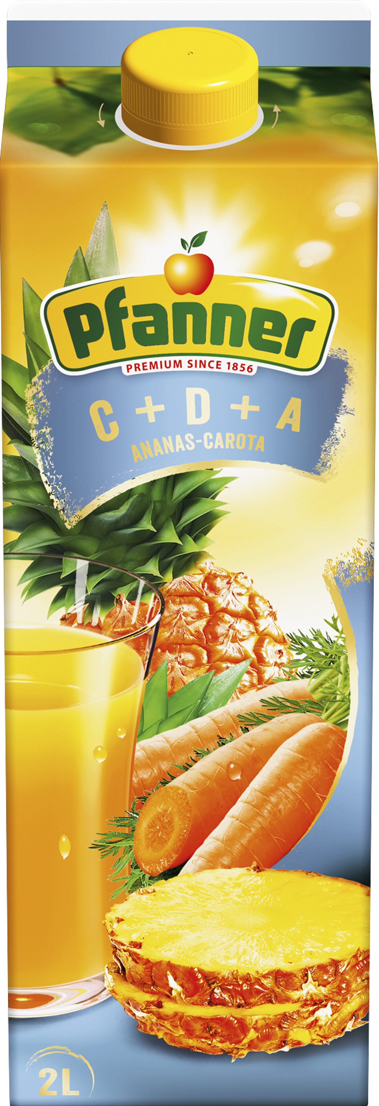 Vollreife Ananas, saftige Orangen, spritzige Zitronen und knackige Karotten: Pfanner CDA ist die wohlschmeckende Vitaminformel für einen erfrischenden Start in einen “starken” Tag. So kombiniert Pfanner CDA in idealer Weise die Vorzüge von Frucht und Gemüse und deckt bereits mit einem Glas von 200 ml 30% des Tagesbedarfs an den Vitaminen